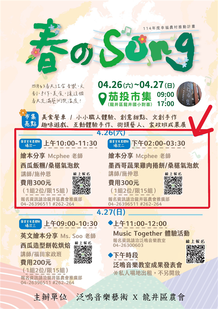 日期:114.4.26 (六)時間:9:00~17:00地點:茄投市集 (龍井區龍井國小對面)